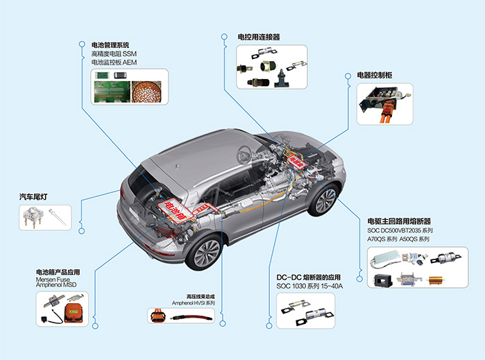 我們可提供用于新能源汽車的直流高壓保險絲、維修開關(guān)、高壓連接器和高壓線束總成、電流霍爾傳感器、高精度低溫漂電阻、大功率電阻和傳感器等產(chǎn)品。